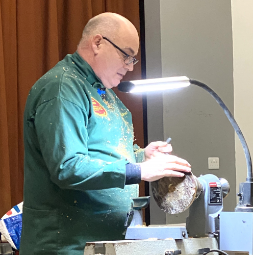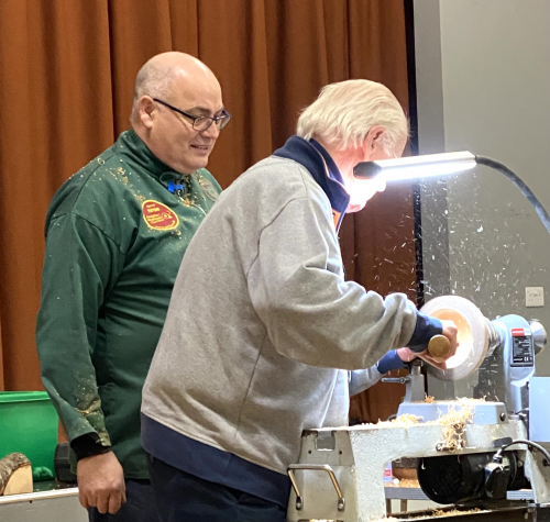 Next up to the lathe was John Lacey, well done to all three members for having a go ( closely watched by Peter )
