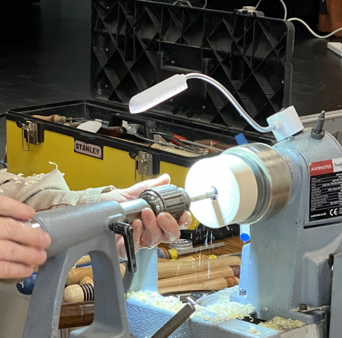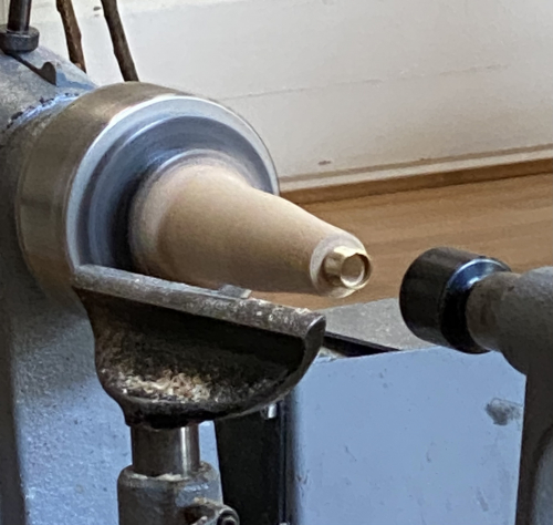 Carlyns second demonstration was turning a tool handle. It was roughly turned and fitted with a brass ferrule.