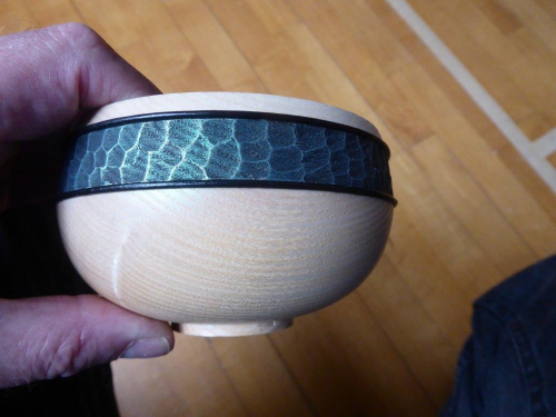 The finished pot dry brushed with gold paint applied to the black acrylic