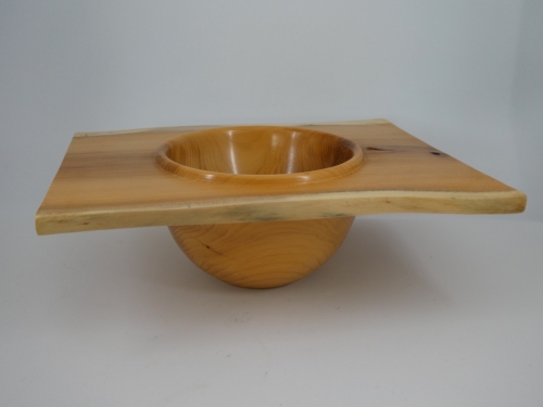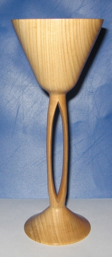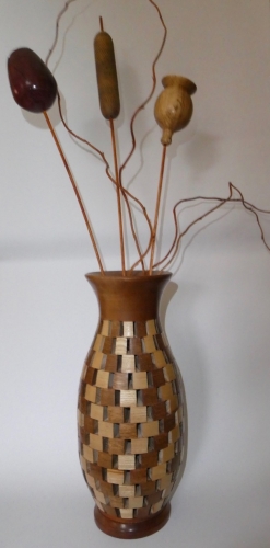 A vase constructed with open segments with turned tulip, poppy and bullrush