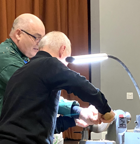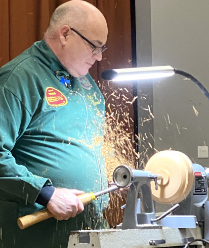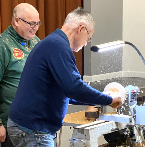 Next up to the lathe was John Lacey, well done to all three members for having a go ( closely watched by Peter )