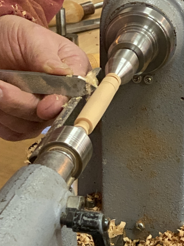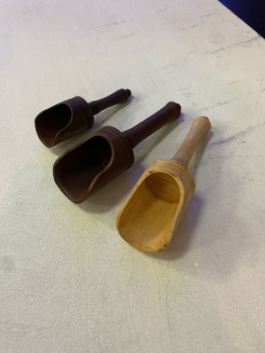 The scoop was removed from the lathe and mounted in a block to support it whilst Stephen cut out the scoop shape with a fret saw.