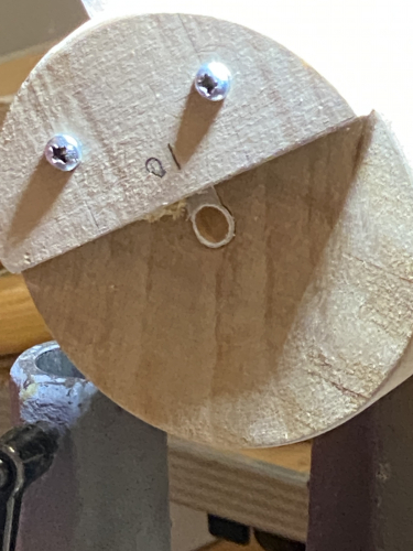 When the spoons were parted Stephen mounted one on his home made jig to secure it, he fixed a half round drill bit in a jacobs chuck in the tail stock and drilled out the dished part of the spoon.