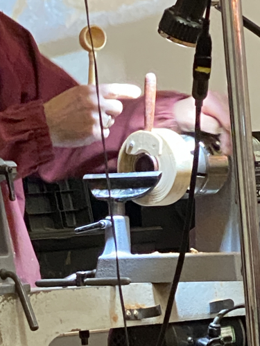 When the blank is dry Stephen proceeds to turn two spoons all in one go !!