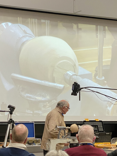 John started the demonstration with the mortar turning the blank to round and adding a dovetail in readiness to turn the bowl around and mount on the chuck.