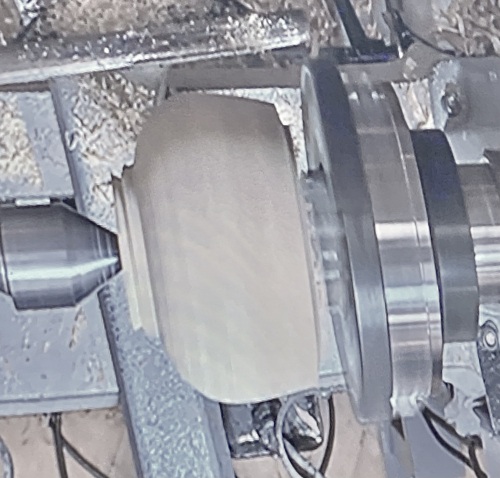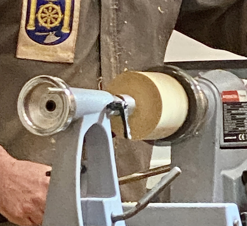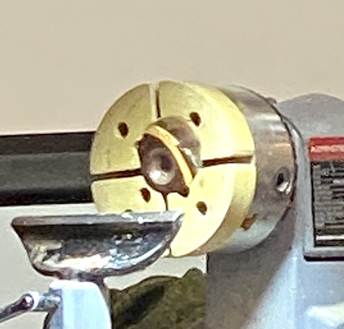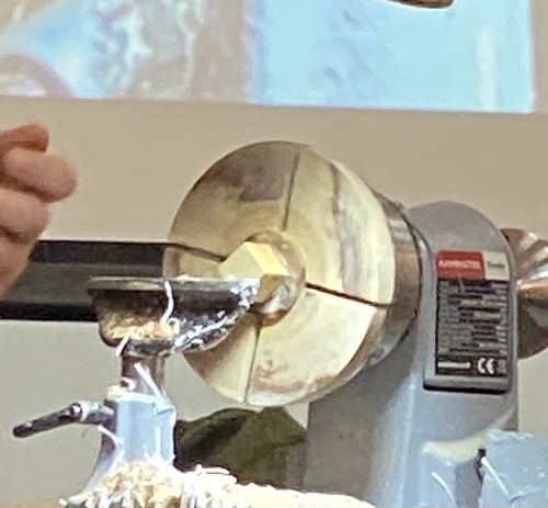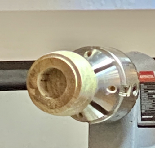 This is the home made off centre wooden jaws that Colwin had made to drill and finish the off centre hole.
