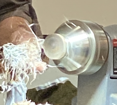 Colwins final demonstration was a off centre Pendent turned from a pre made mixture of wood and resin, it was mounted in the chuck by means of a square block pre-glued to one side.