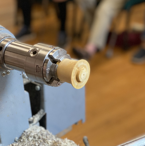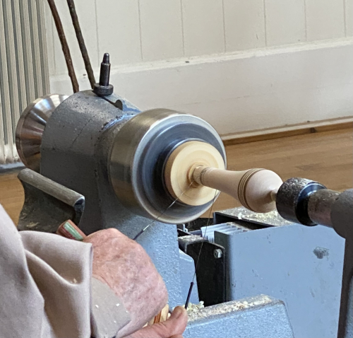 Carlyns second demonstration was turning a tool handle. It was roughly turned and fitted with a brass ferrule.