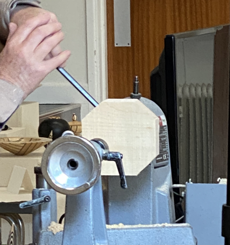 Carlyn carried on and mounted a laminated square section blank ( this was laminated and made before hand ) between centres