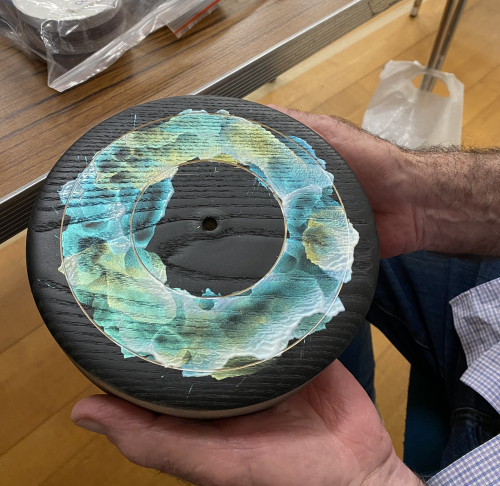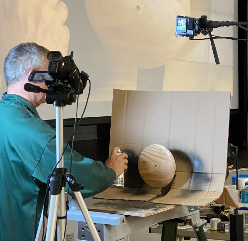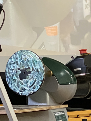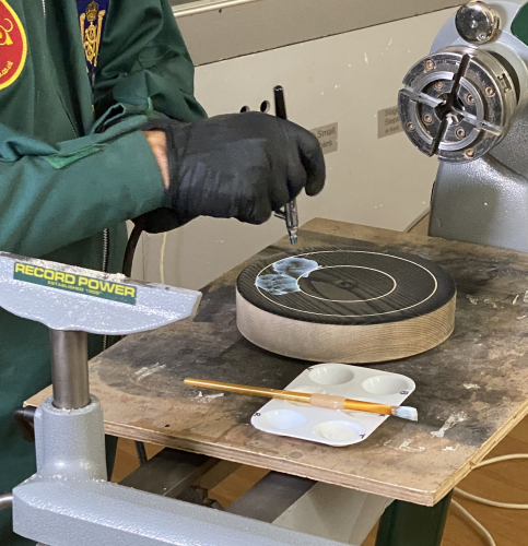 A third blank was mounted on the lathe and paint applied in a star shape, using an inflated balloon