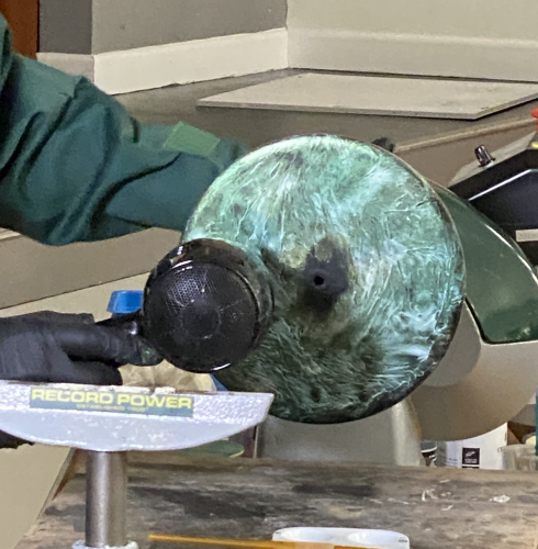 Using a soft buffing wheel with carnauba wax applied he polished one of the items to a high gloss.