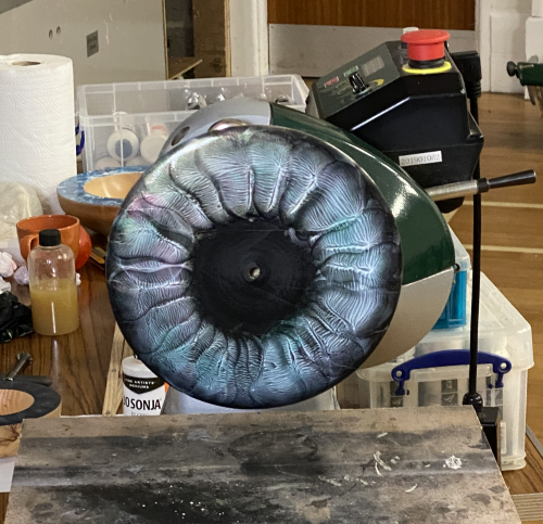 Steve mounted a second prepared turning and applied paint literally all over the surface.