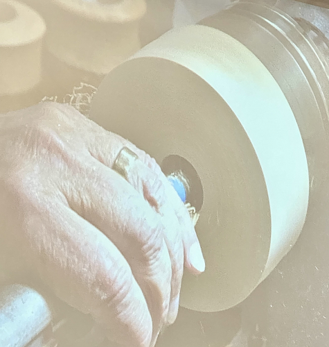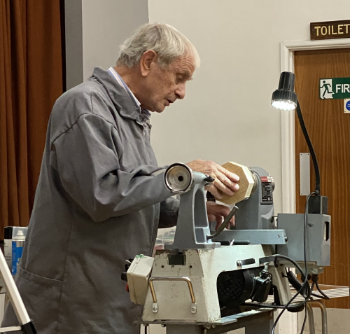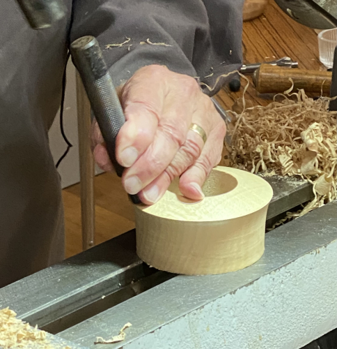 John started by mounting a blank of Sycamore on the chuck and turning it to the round.