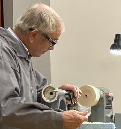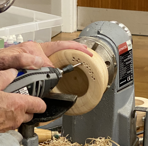 Once turned he started to drill out the hole to accommodate the T light, John started with a small twist drill to prevent overheating the wood.